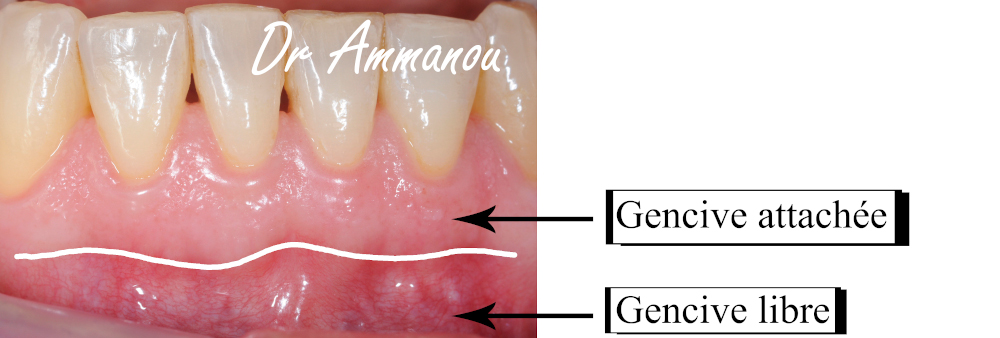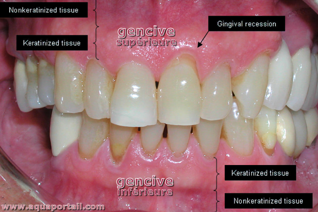 Gencive kératinisée : au niveau de partie cervicale des dents, elle recouvre les processus alvéolaires ; sa surface est rose pâle, granitée ; son épithélialisation est cornée ce qui permet l’adhésion à l’os et la résistance aux aliments mastiqués. La muqueuse alvéolaire non kératinisée, c’est à dire la gencive libre, est plus souple, rouge et vascularisée.