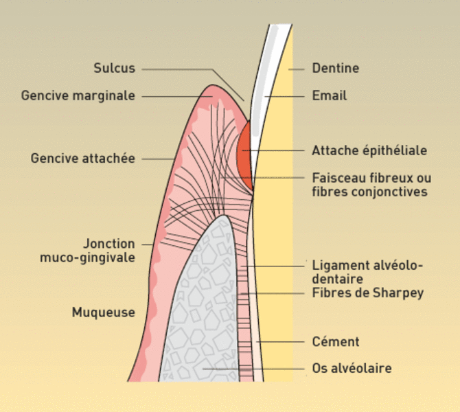Sillon gingival : il est entre la face interne de la gencive libre et la dent, il fait 1 à 3 mm de profondeur, il est limité par l’attache épithéliale qui fixe la gencive à la dent. Le sillon joue a un rôle protecteur pour empêcher la pénétration plus profonde des bactéries ((barrière bactérienne anérobie ?)).